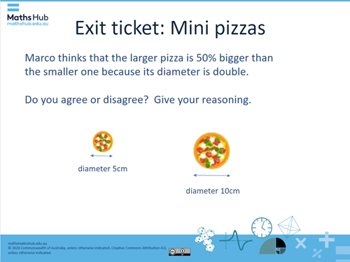 - Introduce this scenario: A pizza company has advertised a new ‘extra-large' pizza, which is 46 cm in diameter and costs $27. The company claims that this new size provides customers with 50% more pizza. (Slide 3)