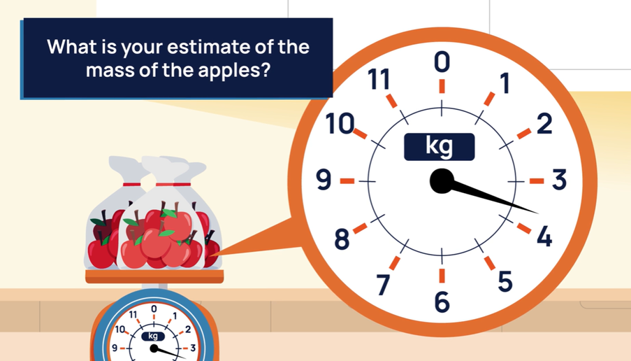 - Go to slide 12 and as a class, watch ESA Springboard maths concepts: Decimals video. Pause at 0:23: ‘What is your estimate of the mass of the apples?’ Students are encouraged to think about (not call out) their estimate.