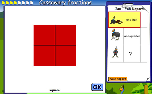 Students design enclosures for cassowaries using simple shapes. They then divide the shapes into the given fractions to create separate pens. Immediate feedback is provided.