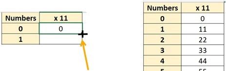2. Use the ‘fill down’ function to generate a sequence for ‘multiply by 11’ from 0 to 39. (Hint: Move your cursor to the bottom right of cell B2, until you see a solid cross, hold the mouse down and drag your cursor all the way down to 39.)