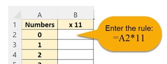 In cell B2, enter the formula ‘=A2*11’ and press ENTER. You should now see the number 0 in B2.