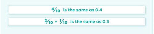 - Recognise the equivalence of fractions and decimals (e.g. half is the same as 0.5 or five-tenths) through the use of correct mathematical language (not zero point five).