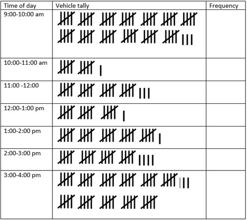 2. Here are the results of a traffic survey, recording the number vehicles that pass by a home in a street close to the local school during a weekday.
