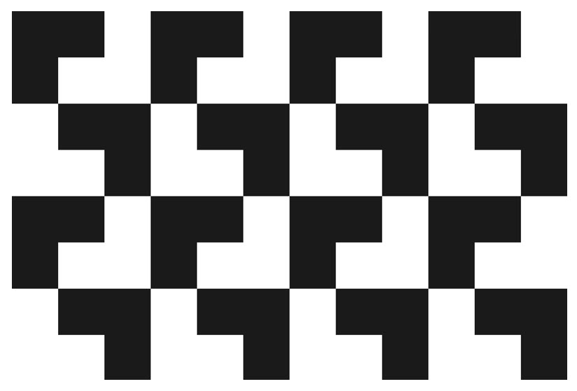 Image of 16 trominos, sorted 4 across and 4 down. The tromino has been slid along four times. The last tromino in the row is rotated a half turn and slid down, before the process is repeated again, forming a tessellation pattern.
