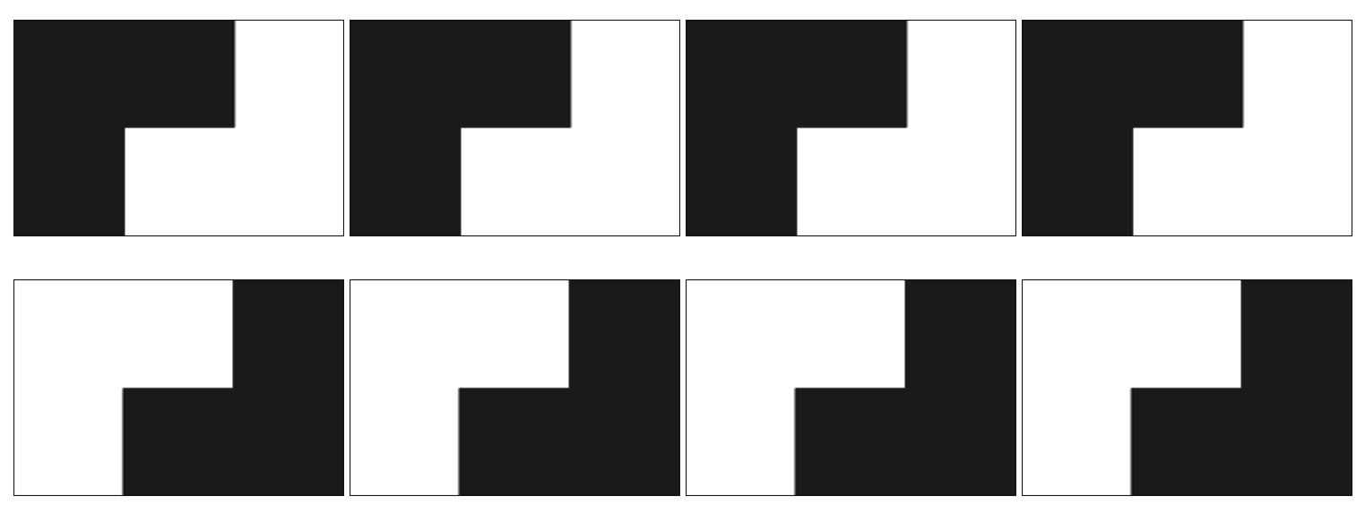 Image of four trominos in a row with gaps inbetween for demonstration purposes. Below is another row of four trominos that have been rotated one half turn and slid down. - The tessellation will look like this: