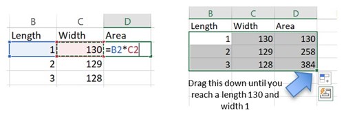 (In this example, that’s 131 cm.) - Create a spreadsheet to explore all the possible combinations of length and width measurements you could have in your rectangle. Follow the example below.