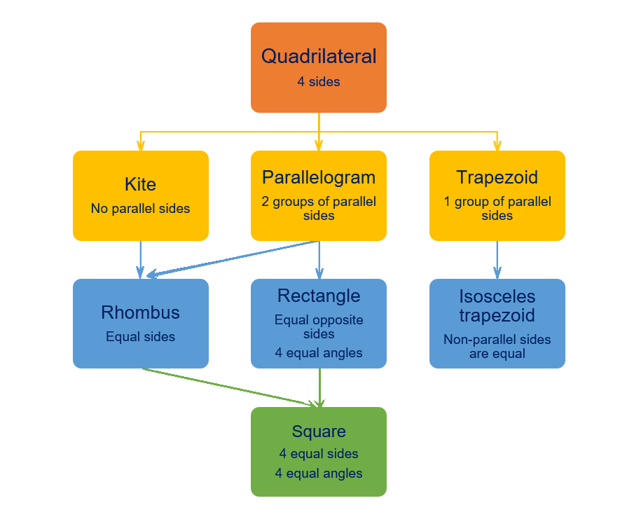 It's important to highlight the hierarchy used in creating and designing these charts about quadrilaterals and polygons, as the levels in the hierarchical scheme illustrate how shapes and their properties are related to each other, for instance. In the design of creating these algorithms, students make connections at a deeper level.