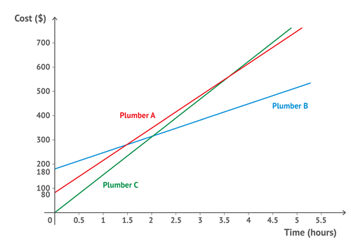 The graph below shows three different plumber quotes (Plumber A, Plumber B and Plumber C), represented as linear functions.