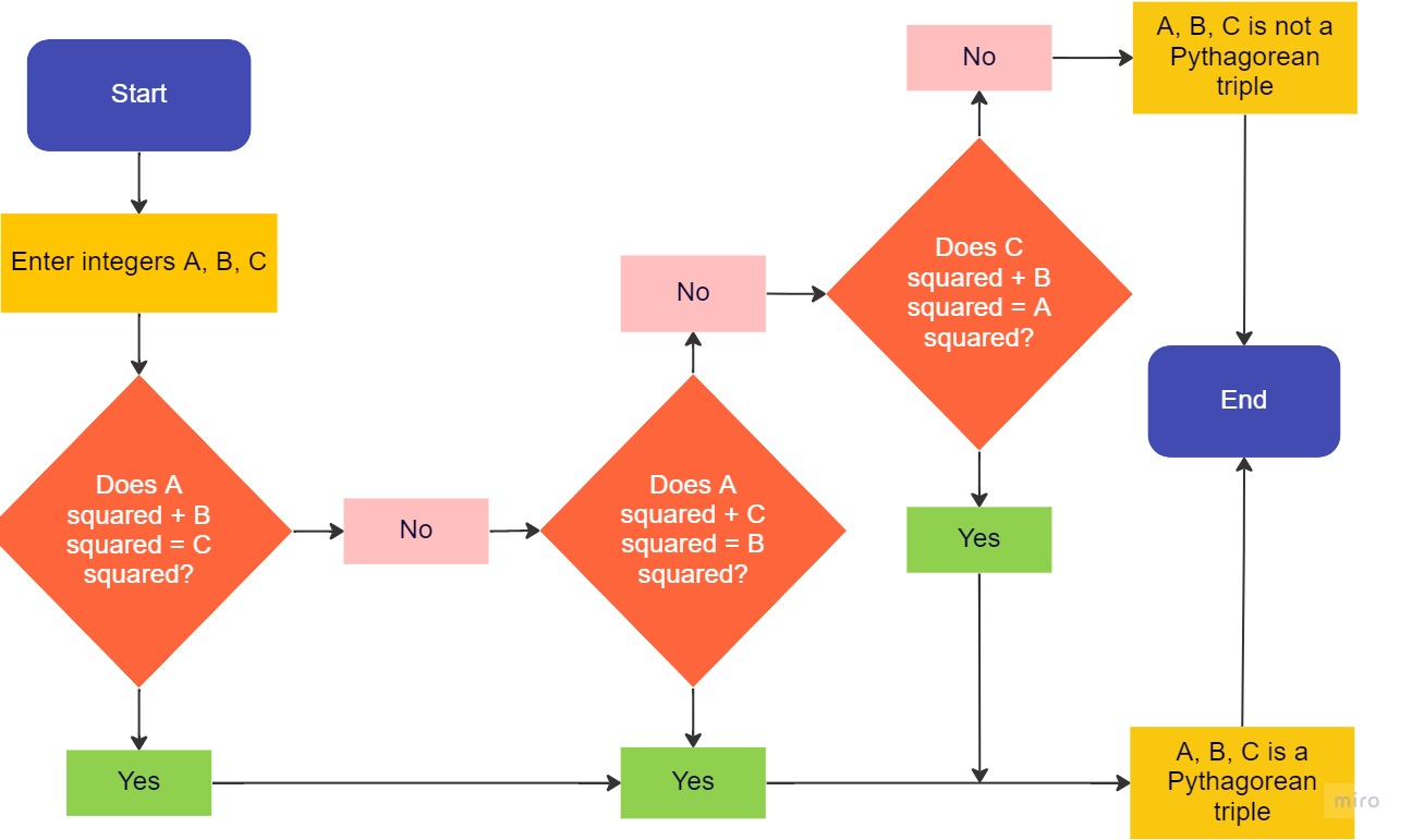 Your task is to produce a set of step-by-step instructions (or a flowchart if you’re keen on a challenge) to guide someone through the solution to one of these problems. The image for this topic on the Planning tool is a wonderful example of a flowchart for determining whether a set of three numbers are a Pythagorean triple. You should consult this image first. You may also choose to use a search engine to browse the many examples of Pythagoras’ theorem and trigonometry flowcharts available. I’ll get you started…