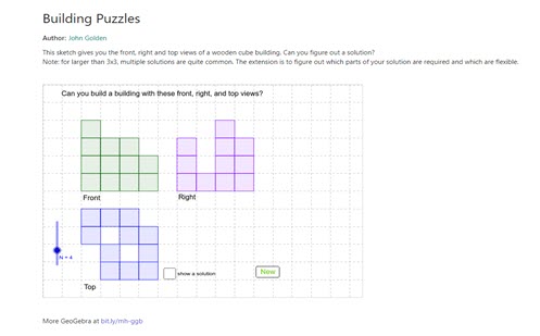In this activity students are asked to create the object from the given view. The answer is given as a matrix, showing the height of each column. The students could use blocks to help them.