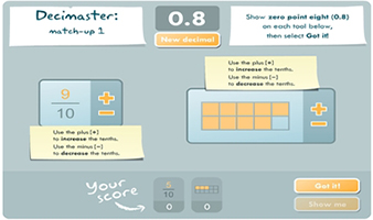 Explore ways of representing decimals. Match a decimal fraction such as 0.7 to an area representation and to a common fraction.