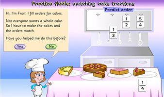 Fill orders in a cake shop. Match a fraction to parts of a cake.