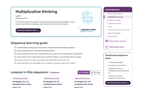 In this sequence of 11 lessons, students analyse and solve multiplicative problems using arrays, equal shares and groups, area models and estimation strategies.