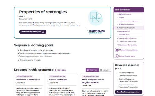 In this sequence of 6 lessons, students apply rectangle formulas, convert units, solve comparative and fixed problems, and analyse variations in area and perimeter.