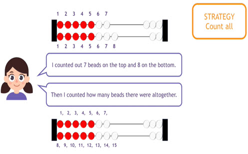 Uses different models, including a rekenrek and a balance scale, to demonstrate different addition strategies for solving this worded problem set on a double decker bus.