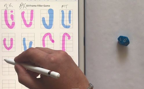 Watch the video to see how to play a strategy game to fill as many ten-frames as you can. The game is played with a dice and a sheet with ten-frames. A player who completes the ten-frame (for example, rolling a three and there is a ten-frame with seven already filled), claims it by writing their initials on top of the ten-frame. The player with the most ten-frames at the end is the winner!