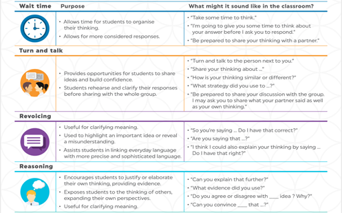 Classroom talk is a tool used in teaching and learning to support students in making sense of complex ideas. Through dialogue students describe observations, explain thinking and make meaning.