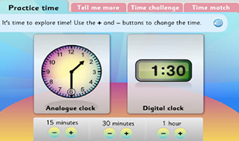 Match the time on two clocks. Use buttons to add and subtract minutes and hours.