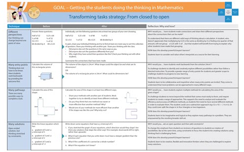 Tasks are presented following a ‘before and after’ approach, demonstrating how a closed-question problem can be modified to an open-ended question. A reflection of why and how provides rationale and benefits for student learning.