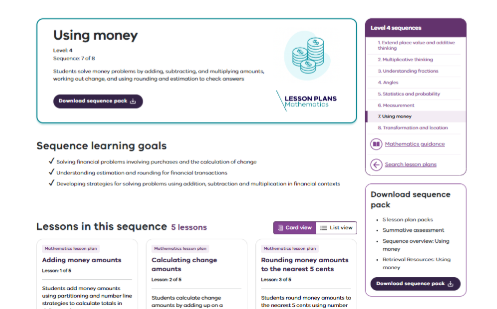 In this sequence of 5 lessons, students solve money problems by adding, subtracting, and multiplying amounts, working out change, and using rounding and estimation to check answers