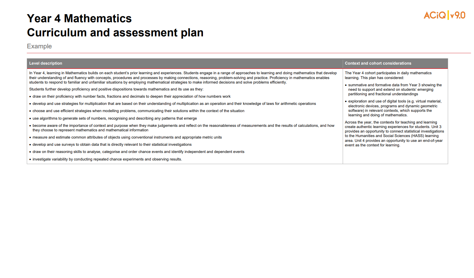A sample year-long plan for Year 4 teachers, structured around four units—one per school term. The plan includes assessment guidance and outlines coverage across relevant strands and content descriptions
