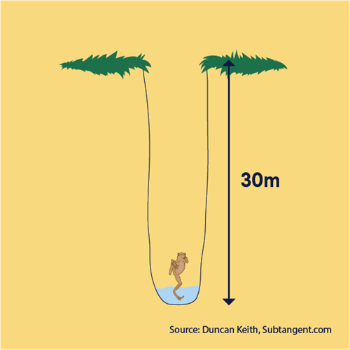 It will take 28 days for the frog to escape. After 27 days and nights the frog only has 3 metres to go. On the 28th day the frog is able to jump to freedom!